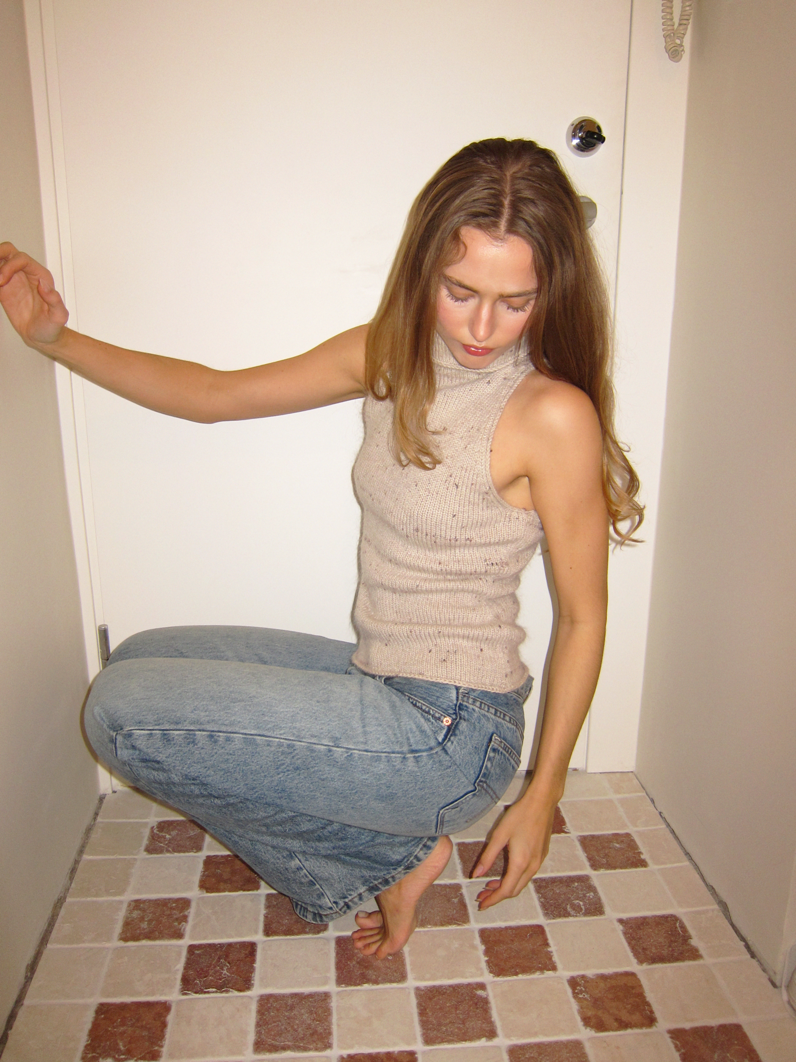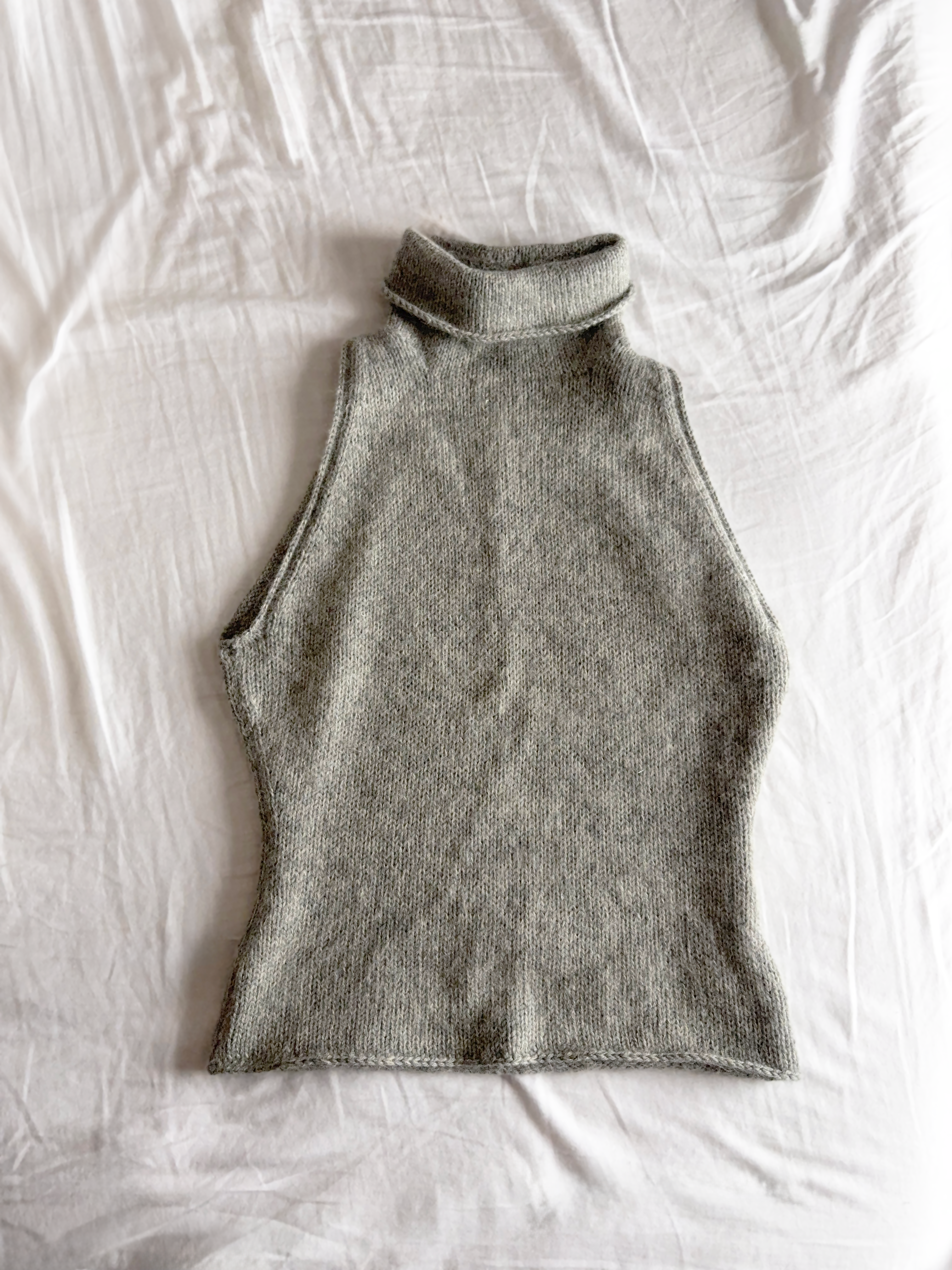 A form fitting knit top with clean lines and a high, double-folded neckline. Worked from the top down, with shaped shoulders, subtle waist decreases, and a neat finish around the neck.